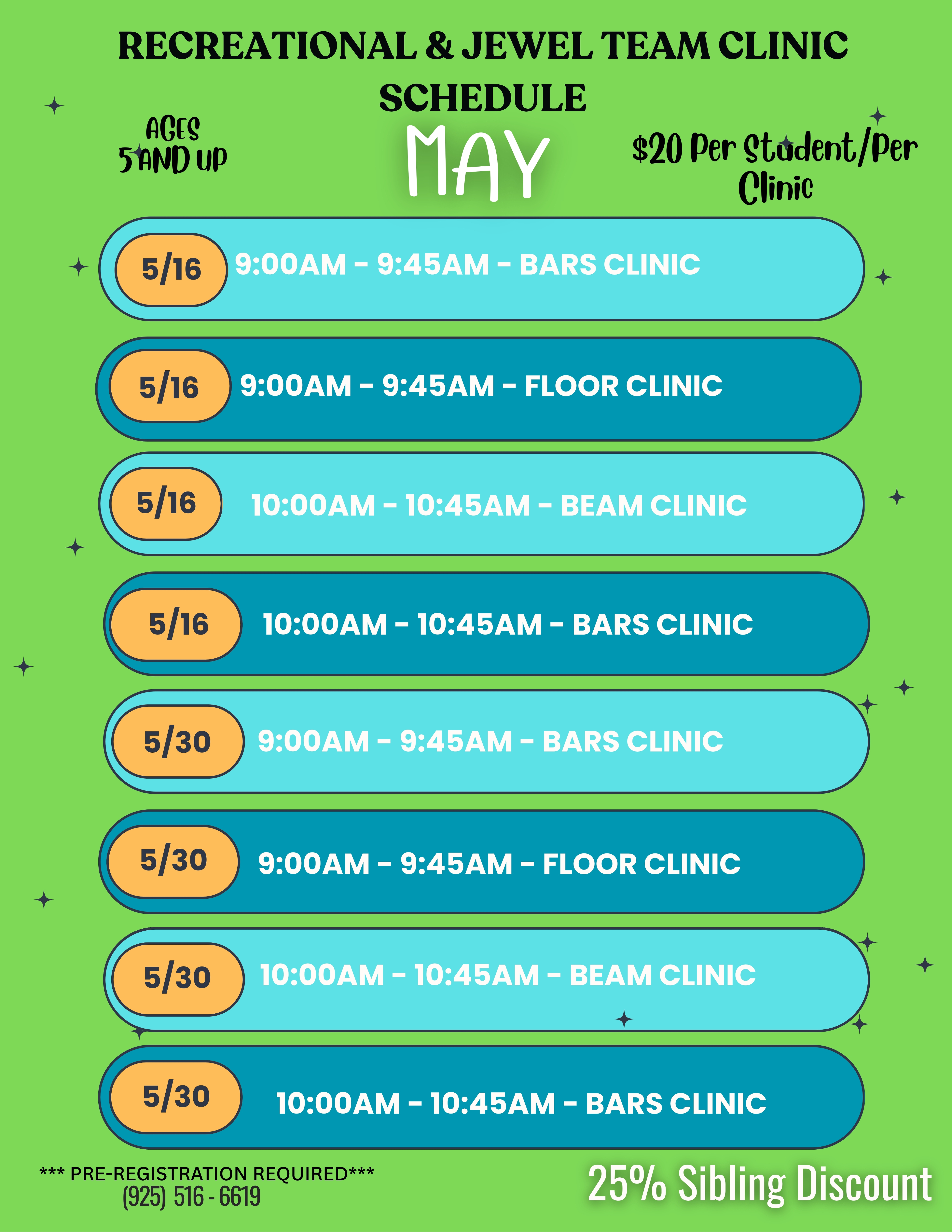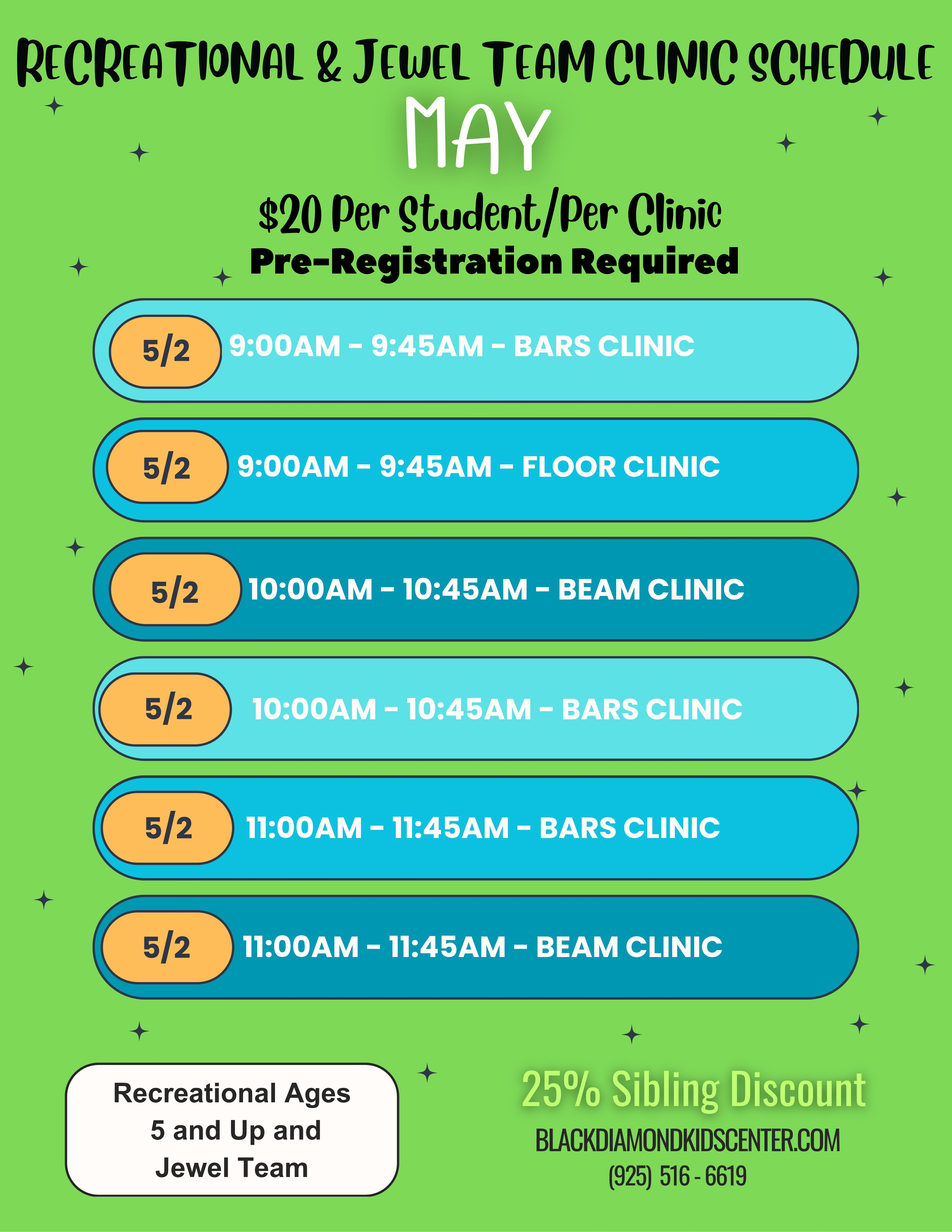 Camps and clinics are a great way to improve your gymnastic skills. With the extended time practicing, your child will be able to master and perfect their skills, especially those ones that are a little more difficult.